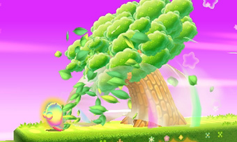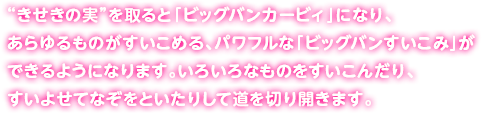 “きせきの実”を取ると「ビッグバンカービィ」になり、あらゆるものがすいこめる、パワフルな「ビッグバンすいこみ」ができるようになります。いろいろなものをすいこんだり、すいよせてなぞをといたりして道を切り開きます。