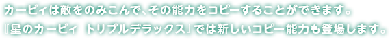 カービィは敵をのみこんで、その能力をコピーすることができます。『星のカービィ トリプルデラックス』では新しいコピー能力も登場します。