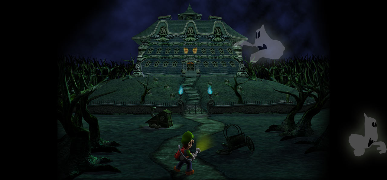 地図をたよりにやしきに向かったルイージは深い森の中でブキミなやしきを発見します。勇気を出して足を踏み入れてみると、先に着いているはずのマリオのかわりにあらわれたのは、なんとオバケたち!