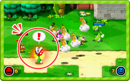 キャラクターの上に「!」が出たら、スペシャルワザのチャンス!合図にあわせてボタンをおすと、攻撃の威力がアップ!