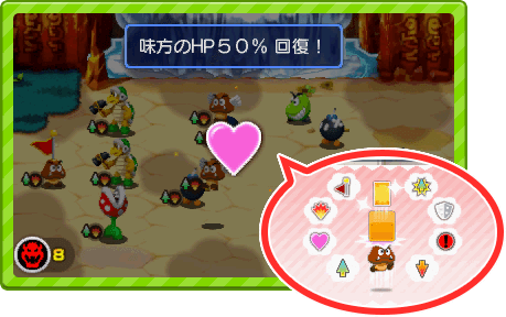 「こうげき力アップ」「経験値アップ」など、ランダムで1つだけいいことがおこる!