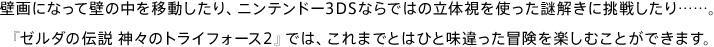 壁画になって壁の中を移動したり、ニンテンドー3DSならではの立体視を使った謎解きに挑戦したり……。『ゼルダの伝説 神々のトライフォース2』では、これまでとはひと味違った冒険を楽しむことができます。