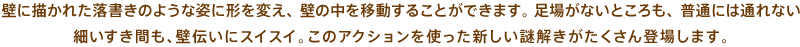 壁に描かれた落書きのような姿に形を変え、壁の中を移動することができます。足場がないところも、普通には通れない細いすき間も、壁伝いにスイスイ。このアクションを使った新しい謎解きがたくさん登場します。
