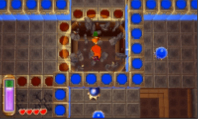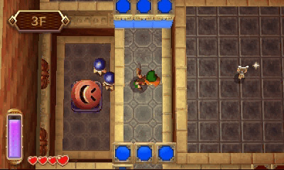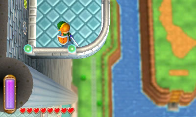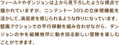 フィールドやダンジョンは上から見下ろしたような視点で描かれていますが、ニンテンドー3DSの立体視機能を活かして、高低差を感じられるような作りになっています。壁画アクションでの平行移動を組み合わせながら、ダンジョンの中を縦横無尽に動き回る新しい冒険を楽しむことができます。