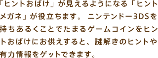 「ヒントおばけ」が見えるようになる「ヒントメガネ」が役立ちます。ニンテンドー3DSを持ちあるくことでたまるゲームコインをヒントおばけにお供えすると、謎解きのヒントや有力情報をゲットできます。