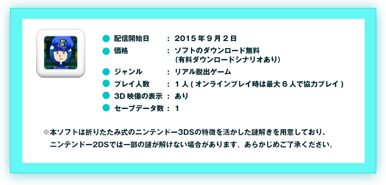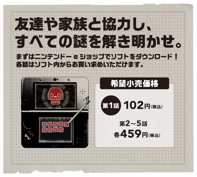 ニンテンドー3DSのニンテンドーeショップのサービス終了に伴い、2023年3月28日(火)午前9時をもちましてソフト本編の配信、およびシナリオの販売を終了いたしました。