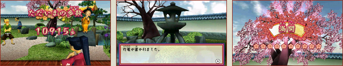 戦いに疲れたら、庭園でひと休み。はじめは何も咲いていない静かな庭ですが、 ニンテンドー3DSを持ち歩いて貯めた歩数を木に奉納することで桜が咲きます。 満開が出ると池に橋がかかったり、灯籠が置かれたりと物も増え、 どんどん美しい庭に成長していきます。どこかで見かけた人達が遊びに来ることも?