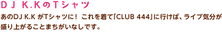 DJ K.KのTシャツ あのDJ K.K がTシャツに! これを着て「CLUB 444」に行けば、ライブ気分が盛り上がることまちがいなしです。