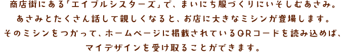 商店街にある「エイブルシスターズ」で、まいにち服づくりにいそしむあさみ。あさみとたくさん話して親しくなると、お店に大きなミシンが登場します。そのミシンをつかって、ホームページに掲載されているQRコードを読み込めば、マイデザインを受け取ることができます。