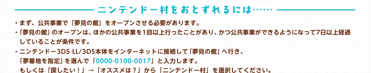 任天堂の世界観がつまった村「ニンテンドー村」がオープン! 「ニンテンドー村」へは、「夢見の館」で「夢番地」を入力することでおとずれることができます。夢の中の村でセイイチに出会うと、任天堂や 『とびだせ どうぶつの森』にちなんだマイデザインがもらえます。ニンテンドー村 夢番地 0000-0100-0017