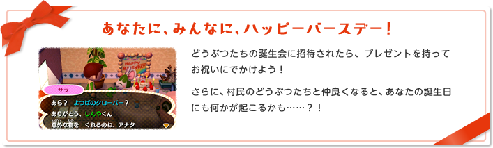 あなたに、みんなに、ハッピーバースデー!どうぶつたちの誕生会に招待されたら、プレゼントを持ってお祝いにでかけよう!さらに、村民のどうぶつたちと仲良くなると、あなたの誕生日にも何かが起こるかも……?!