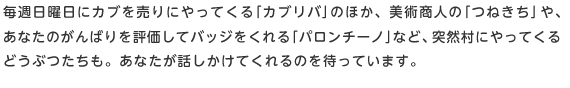 毎週日曜日にカブを売りにやってくる「カブリバ」のほか、美術商人の「つねきち」や、あなたのがんばりを評価してバッジをくれる「パロンチーノ」など、突然村にやってくるどうぶつたちも。あなたが話しかけてくれるのを待っています。