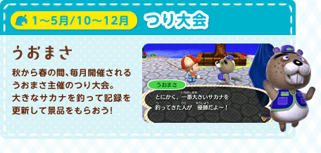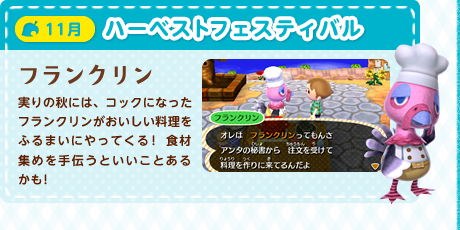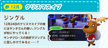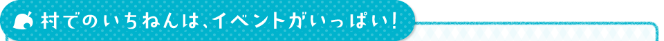 気ままな暮らしをいろどるちょっぴり楽しいできごとや、季節ごとのとくべつなお祭りなど、村にはイベントがいっぱい。ふだんは見かけないどうぶつにも思い切って話しかけてみれば、ステキな思い出を残せるかもしれません。たとえばこんなイベントがあります!