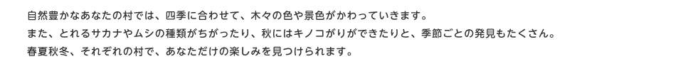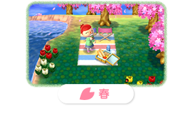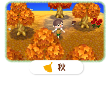 自然豊かなあなたの村では、四季に合わせて、木々の色や景色がかわっていきます。また、とれるサカナやムシの種類がちがったり、秋にはキノコがりができたりと、季節ごとの発見もたくさん。春夏秋冬、それぞれの村で、あなただけの楽しみを見つけられます。