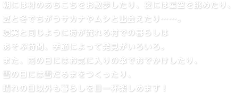 朝には村のあちこちをお散歩したり、夜には星空を眺めたり、夏と冬でちがうサカナやムシと出会えたり……。現実と同じように時が流れる村での暮らしは