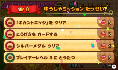 ゆうしゃミッションの内容は、クエストせんたくで、確認できるから、どんどん挑戦してみてネ。