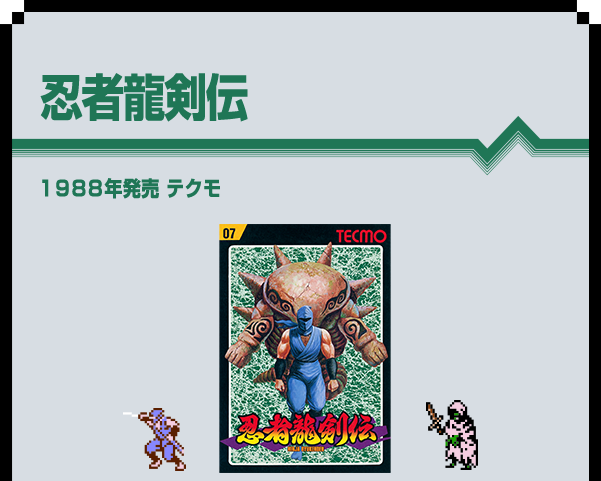 父の遺言に従い秘伝の龍剣を持って、渦巻く野望が待ち受けるアメリカに渡ったリュウ・ハヤブサ。手裏剣や炎波の術など、忍術を使って敵と戦うアクションゲーム。入り組んだ地形では、壁から壁へ飛び移る「壁蹴りジャンプ」を使うのがコツ。手ごたえある難易度に加えて、ゲーム内のビジュアルシーンが、物語を盛り上げます。