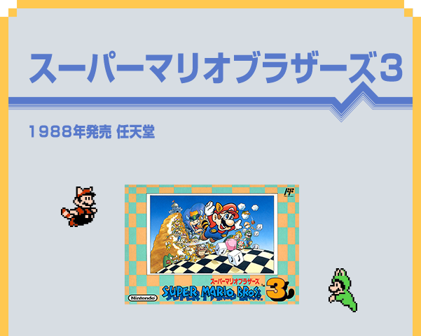 大魔王クッパとコクッパたちに奪われた7本の魔法の杖を取り戻すため、マリオとルイージがキノコワールドの冒険に出発するアクションゲーム。マップ画面にはクッパの手下が守る砦や、アイテムが手に入るキノピオの家などが出現。空を飛べる「しっぽマリオ」や、泳ぎが得意な「カエルマリオ」などに変身しながら、8つのワールドを冒険。