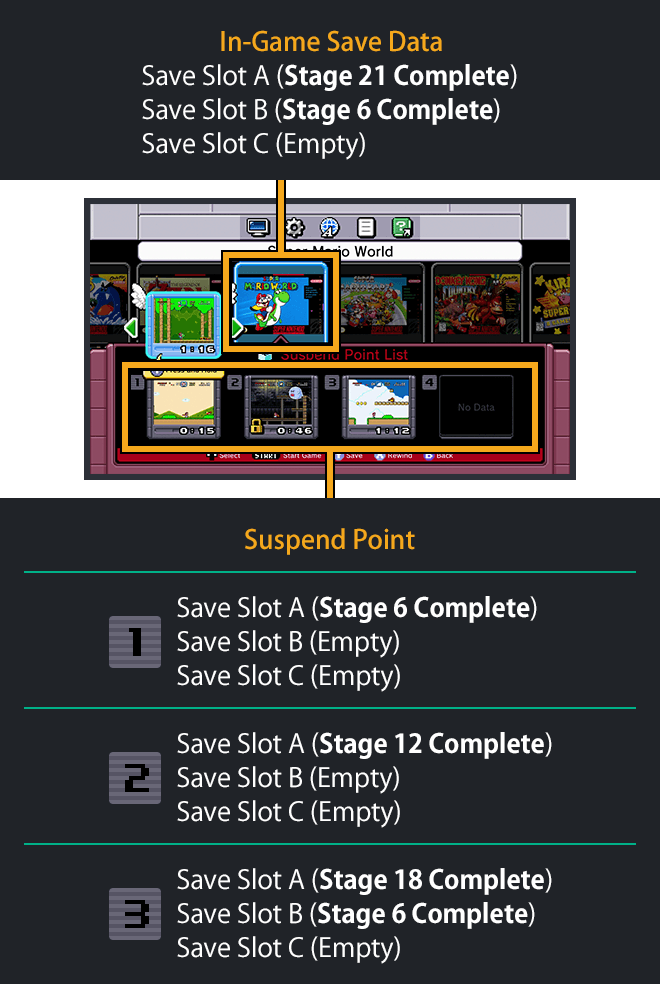 Please take extra care when loading suspend points if the console is used by multiple people. There are four suspend points, so it may be a good idea to decide in advance who saves where to prevent your data from being overwritten by another player.