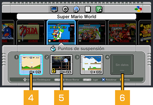 para reanudar la partida desde el punto seleccionado.Nota: Podrás rebobinar unos 4 o 5 minutos de la partida en los juegos de tipo RPG o simulación, o unos 40 o 50 segundos en los de otros géneros.