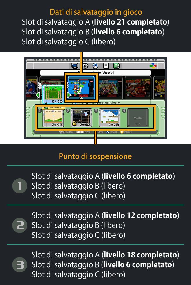 Nell'esempio qui sopra, riprendere la partita dal punto di sospensione sovrascrive i dati di salvataggio regolari con i dati del punto di sospensione.
