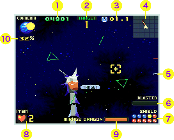 戦闘中に倒すべき敵の数が、残りターゲット数として表示されます。惑星ではコアが隠されている要塞や、その要塞を出現させるためのスイッチなども、残りターゲット数に含まれます。