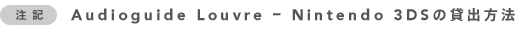 2012年4月10日 - 任天堂株式会社は、同社と世界最多来館者数を誇るパリのルーブル美術館の継続的パートナーシップの一環として、専用のAudioguide(オーディオガイド)を内蔵したニンテンドー3DSシステムをルーブル美術館に提供する。Audioguide Louvre - Nintendo 3DS(オーディオガイドルーブル - ニンテンドー3DS)は2012年4月11日以降、ルーブル美術館の来館者が利用できるようになる。任天堂とルーブル美術館はこのパートナーシップによって、来館者が楽しいインタラクティブな方法で芸術文化への知識を深められるツールを提供できることを期待している。