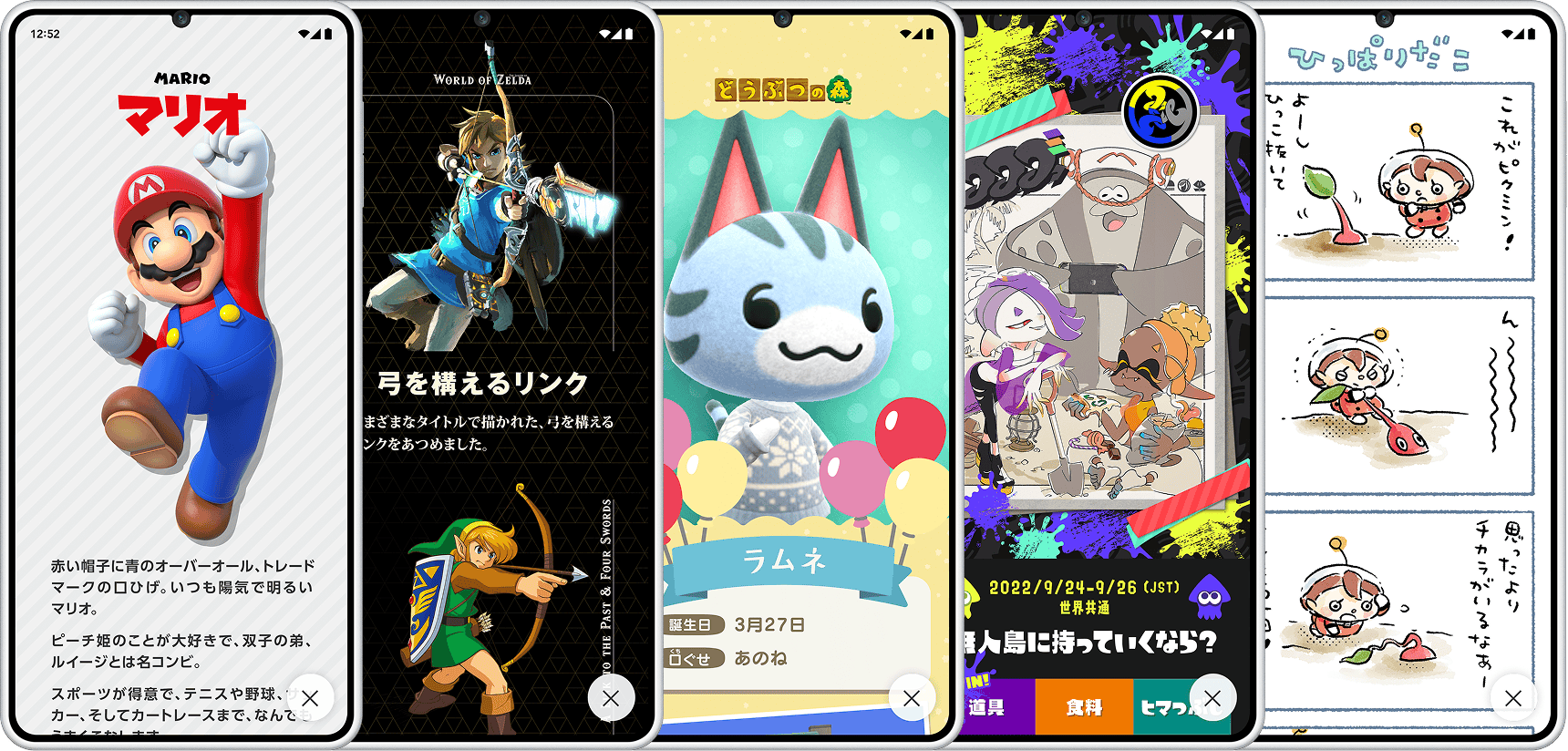 お好みのゲームシリーズの任天堂キャラクターが、アニメーションで毎日の日付をお知らせします。ゲームシリーズは、「スーパーマリオ」「ゼルダの伝説」「どうぶつの森」「スプラトゥーン」「ピクミン」の5つから選べます。