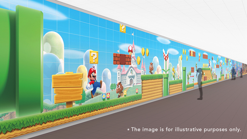 Nintendo Co., Ltd. (HQ: Kyoto, Minami-ku, Japan; Representative Director and President: Shuntaro Furukawa) will unveil graphics depicting the world of Super Mario on the north and south walls of the Shijo-dori underground walkway near Exit 10 up to Exit 11 starting October 5, 2023. This is being done as part of the Shijo-dori underground walkway activation initiative by the Conference of Shijo-dori Underground Walkway Activation, consisting of Shijo Han’eikai Shopping Street Promotion Associations, Hankyu Corporation, and the City of Kyoto.