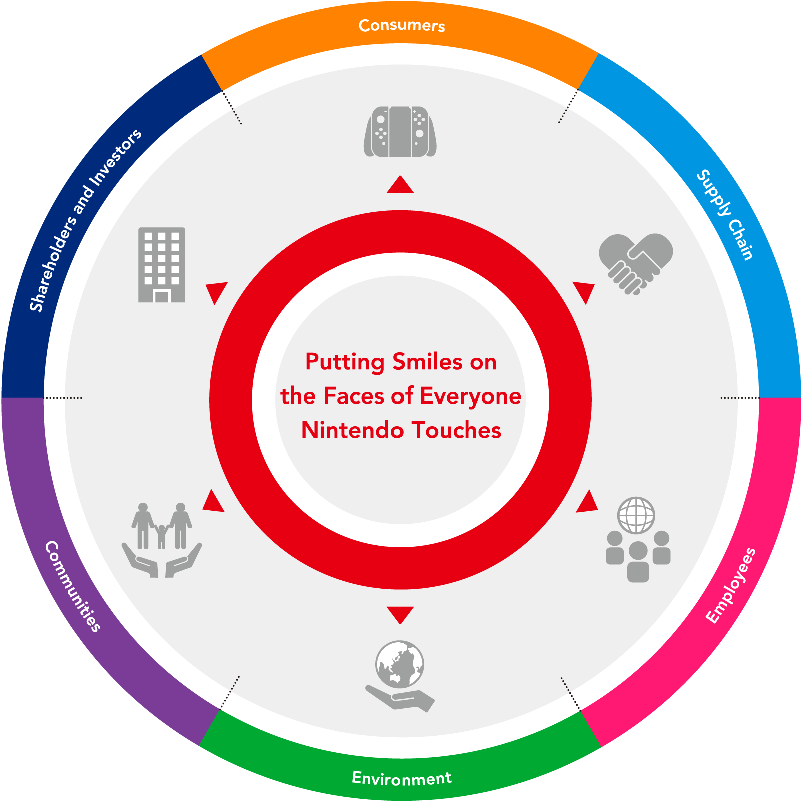 “Everyone Nintendo touches” refers to all our stakeholders. In addition to our consumers, this includes everyone working in the supply chain, Nintendo employees, our shareholders and investors, as well as the global environment.
