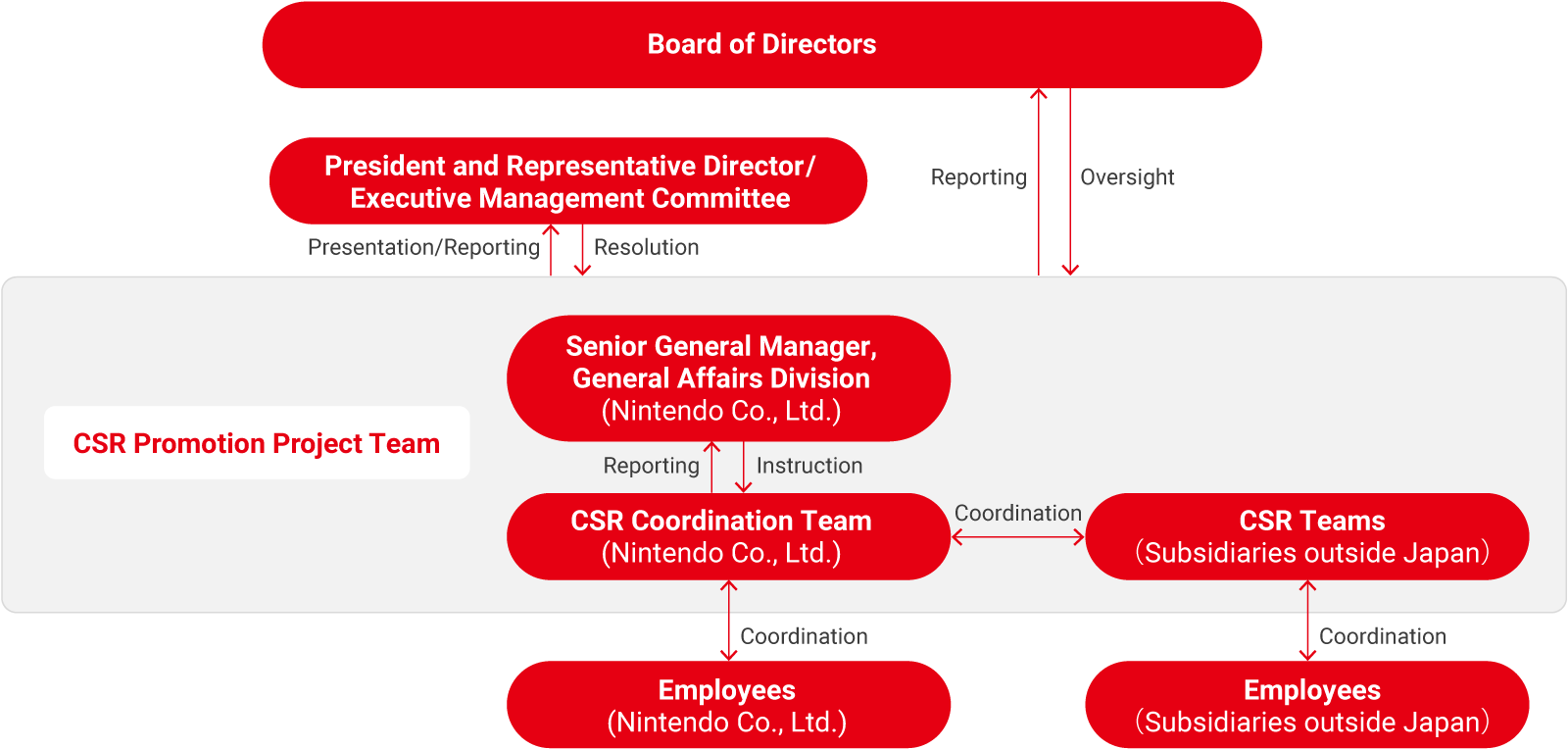 At Nintendo, under the supervision of the Senior General Manager of the General Affairs Division at Nintendo, Co. Ltd. (Japan), the CSR Promotion Project Team coordinates, supports and promotes CSR activities while collaborating with the entire group.