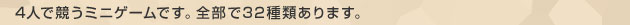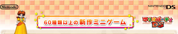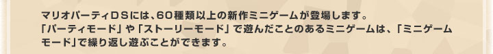 マリオパーティDSには、60種類以上の新作ミニゲームが登場します。ミニゲームを遊ぶことができる「ミニゲームモード」では、「ストーリーモード」や「パーティモード」などで遊んだことのあるミニゲームが登場します。