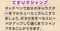 てすりでジャンプ:タッチペンで自分のキャラクターを下から上へたくさんこすりましょう。手すりをすべるスピードがアップして遠くまでジャンプすることができます。