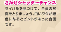 さがせシャッターチャンス:ライバルを見つけて、全員の写真をとりましょう。白いワクが緑色になるとピントがあった合図です。