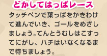 どかしてはっぱレース:タッチペンで葉っぱをかきわけて進んでいき、ゴールをめざしましょう。てんとうむしはこすってにがし、ハチはいなくなるまで待ちましょう。
