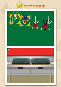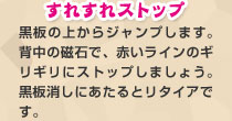 すれすれストップ:黒板の上からジャンプします。背中の磁石で、赤いラインのギリギリにストップしましょう。黒板消しにあたるとリタイアです。
