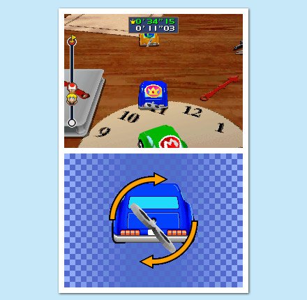 ぜんまいレース:タッチペンで、ぜんまいをまいてクルマを動かします。障害物をよけながらゴールをめざしましょう。