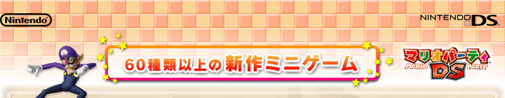 マリオパーティDSには、60種類以上の新作ミニゲームが登場します。ミニゲームを遊ぶことができる「ミニゲームモード」では、「ストーリーモード」や「パーティモード」などで遊んだことのあるミニゲームが登場します。
