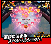 各キャラクターは、特定のドリブルコマンドを入力すると発動する"スペシャルショット"と呼ばれる必殺シュートを持っています。3ポイントラインの内側ではなつと無敵のシュートになり、3ポイントラインの外側からはなったシュートを味方がキャッチできれば、豪快なアリウープが! 邪魔されずにコマンド入力できれば、ド派手なシュートを相手ゴールに叩き込む爽快感を味わえます。 |