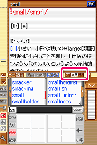 [派・複]ボタンをタッチして点灯させると、英和辞典の「派生語・複合語」を検索候補に含めて表示させることが出来ます。消灯させると、含めずに候補を表示します。
