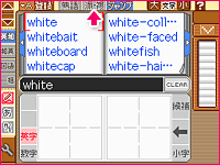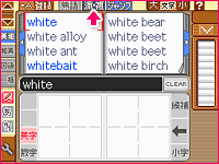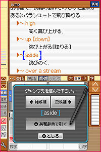 上画面に英単語が表示されている状態で、タッチパネル上の[ジャンプ]ボタンをタッチすると、ジャンプ検索候補の選択ダイヤログ画面が出現しますので、検索したい英単語を選択して「英和辞典で引く]ボタンをタッチすれば、簡単にその単語を英和辞典で引くことが出来ます。
