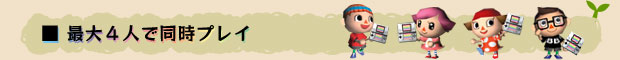 ※今までのソフトと同様に、1本のソフトに4人まで暮らすことができます。 ※同時プレイを楽しむためには、人数分のニンテンドーDS本体とソフトが必要です。 また、同じ村に住むキャラクター同士を使って通信プレイを楽しむことはできません。