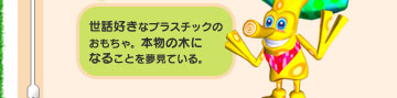 世話好きなプラスチックのおもちゃ。本物の木になることを夢見ている。