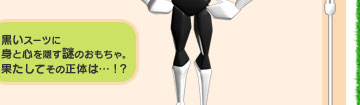 お花を黒色に変えるチン生物。怒ると真っ赤になって追いかけてくる。 黒いスーツに身と心を隠す謎のおもちゃ。果たしてその正体は…!?