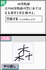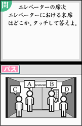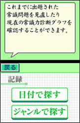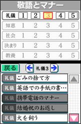 【テーマ別問題】を選択すると、「礼式」、「交通」、「芸術」、「音楽」など様々なテーマの常識問題に挑戦することができます。絵やイラストを見て回答したり、DSから流れる音楽を聴いて解く問題など、テーマに合わせた様々な形式の問題が用意されています。