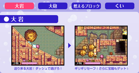 危険なワナが待つ遺跡や通路が隠された洞窟など、バラエティに富んだ数々のステージがカービィを待ち受けています。ワナをかわし、しかけを上手く使って先を急ごう!