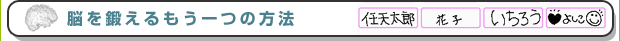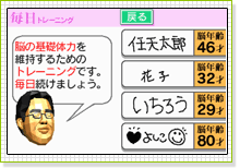 | メニュー画面には個人データごとに脳年齢が表示されています。みんなの実際の年齢と脳年齢を比較してみると面白いかもしれません。 |