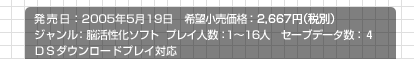 発売日:2005年5月19日 希望小売価格:2,667円(税別) ジャンル:脳活性化ソフト プレイ人数:1〜16人 セーブデータ数:4  DSダウンロードプレイ対応取扱店や商品についてのお問い合わせはこちら