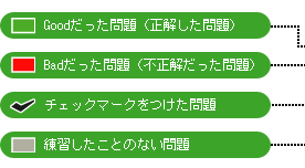 過去の解答状況(正解・不正解)が色分け表示されるほか、気になる問題には自分でチェックマークをつけることもできます。