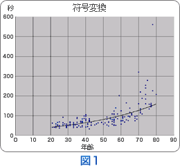 20代から70代までの各二十数名、計156名から採集した成績データからベストフィットの近似(図1)を割り出しました。「もっと脳を鍛える大人のDSトレーニング」の脳年齢チェックで測定できる脳年齢は、この近似式により、算出されたものです。